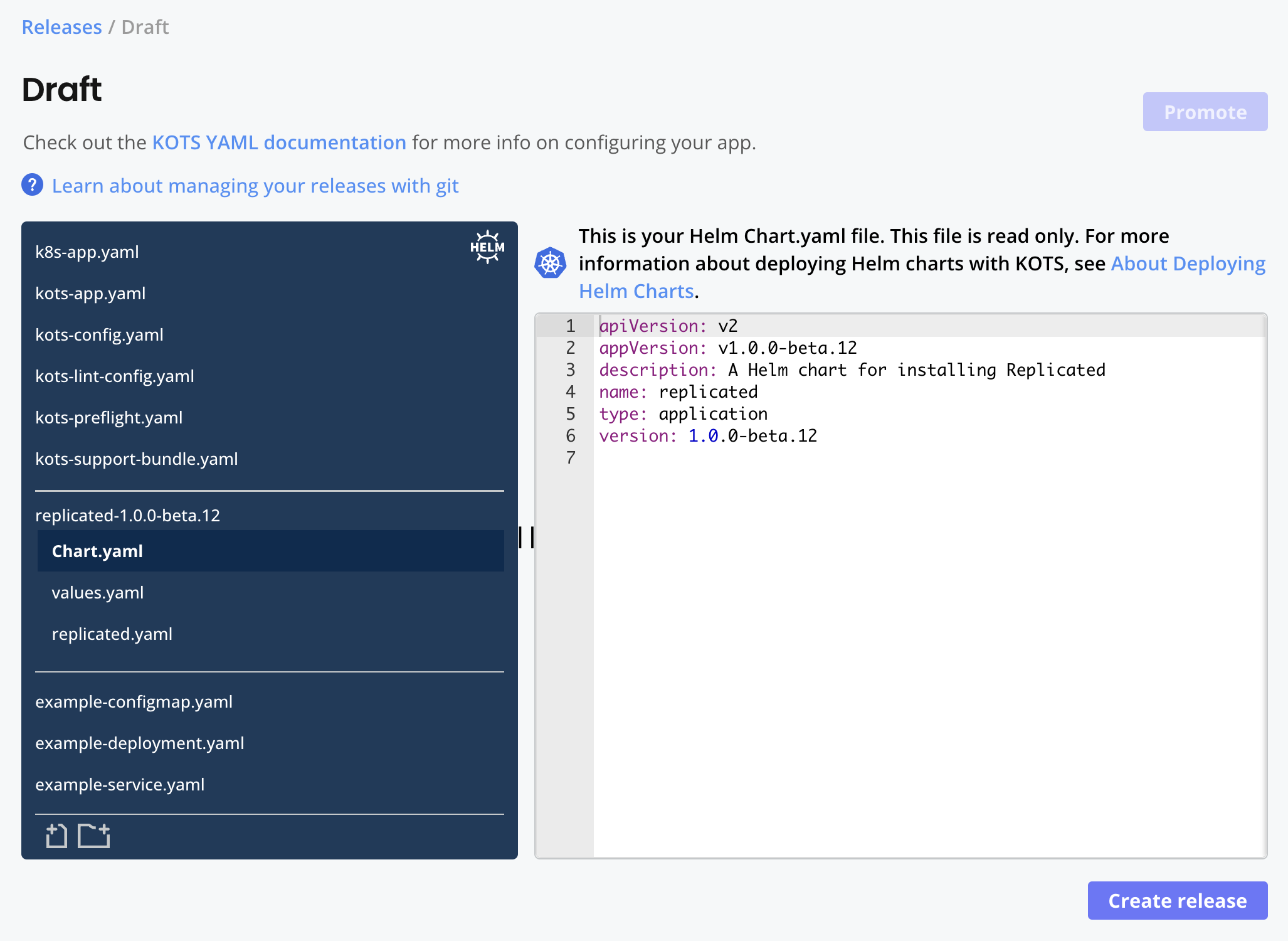 4. If one was not created automatically, add a KOTS HelmChart custom resource to the release. HelmChart custom resources have apiVersion: kots.io/v1beta2 and kind: HelmChart.